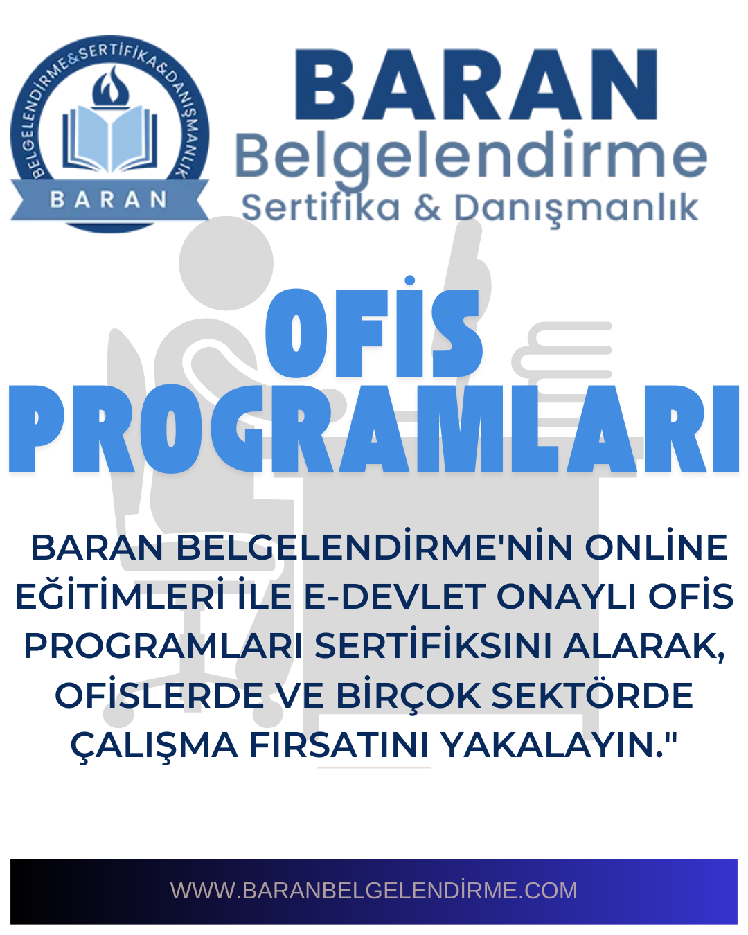 Ofis programları, özellikle Word ve Excel, iş dünyasında en çok tercih edilen beceriler arasında yer alır. Baran Belgelendirme olarak, Word ve Excel eğitimlerini online uzaktan eğitim yöntemiyle sunuyoruz. Aldığınız e-Devlet onaylı resmi sertifika ile farklı sektörlerde çalışma imkânı elde edebilirsiniz.